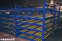 重型流利式貨架每層前后橫梁之間設置滾輪式鋁合金或鈑金流力條,呈一定坡度(3°左右)放置。貨物通常為紙包裝或將貨物放于塑料周轉箱內,利用其自重實現貨物的流動和先進先出,貨物由小車進行運送。人工存取,存取方便,單元貨架每層載重量通常在1000KG左右,貨架高度在2.5米以內。適于裝配線兩側的工序轉換的揀選作業等場所,可配以電子標簽實現貨物的信息化管理。